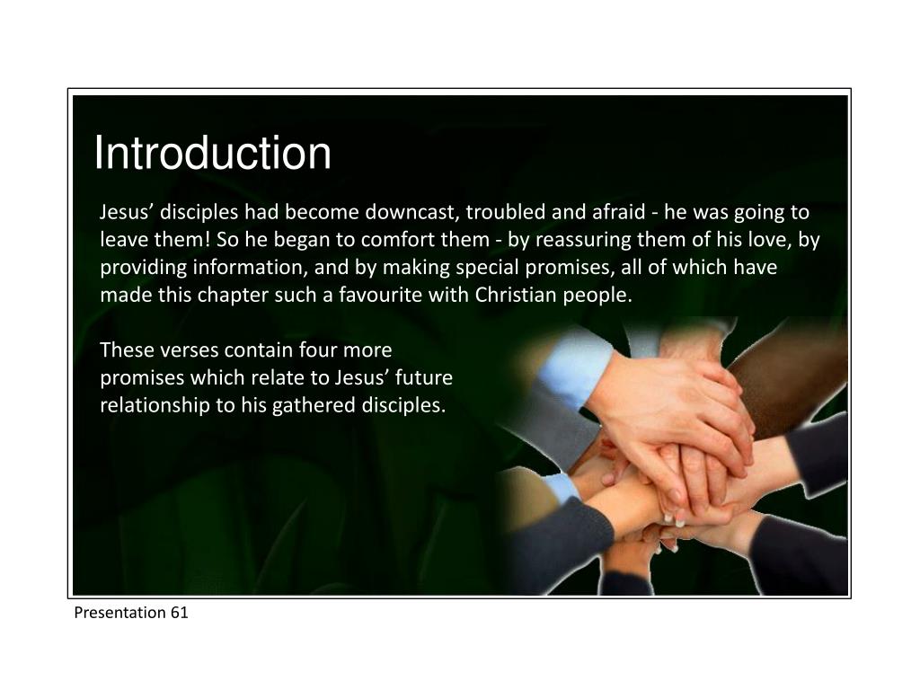 Introduction Jesus’ disciples had become downcast, troubled and afraid - he was going to leave them! So he began to comfort them - by reassuring them of his love, by providing information, and by making special promises, all of which have made this chapter such a favourite with Christian people. These verses contain four more promises which relate to Jesus’ future relationship to his gathered disciples. Presentation 61