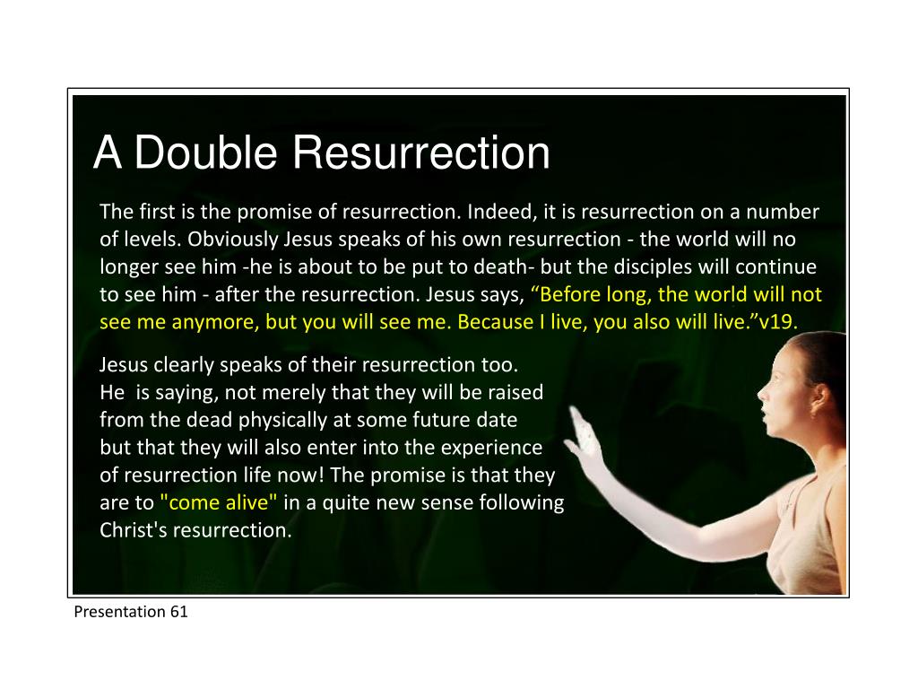 A Double Resurrection The first is the promise of resurrection. Indeed, it is resurrection on a number of levels. Obviously Jesus speaks of his own resurrection - the world will no longer see him -he is about to be put to death- but the disciples will continue to see him - after the resurrection. Jesus says, “Before long, the world will not see me anymore, but you will see me. Because I live, you also will live.”v19. Jesus clearly speaks of their resurrection too. He is saying, not merely that they will be raised from the dead physically at some future date but that they will also enter into the experience of resurrection life now! The promise is that they are to "come alive" in a quite new sense following Christ's resurrection. Presentation 61