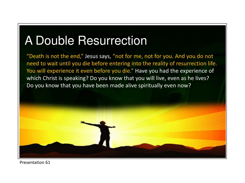 A Double Resurrection “Death is not the end,” Jesus says, “not for me, not for you. And you do not need to wait until you die before entering into the reality of resurrection life. You will experience it even before you die.” Have you had the experience of which Christ is speaking? Do you know that you will live, even as he lives? Do you know that you have been made alive spiritually even now? Presentation 61