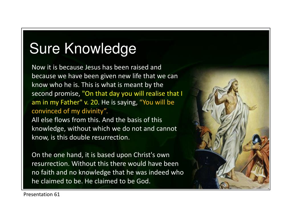 Sure Knowledge Now it is because Jesus has been raised and because we have been given new life that we can know who he is. This is what is meant by the second promise, "On that day you will realise that I am in my Father" v. 20. He is saying, “You will be convinced of my divinity”. All else flows from this. And the basis of this knowledge, without which we do not and cannot know, is this double resurrection. On the one hand, it is based upon Christ's own resurrection. Without this there would have been no faith and no knowledge that he was indeed who he claimed to be. He claimed to be God. Presentation 61