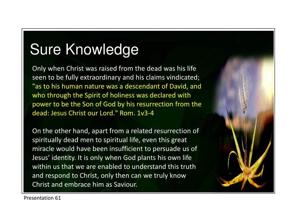 Sure Knowledge Only when Christ was raised from the dead was his life seen to be fully extraordinary and his claims vindicated; "as to his human nature was a descendant of David, and who through the Spirit of holiness was declared with power to be the Son of God by his resurrection from the dead: Jesus Christ our Lord." Rom. 1v3-4 On the other hand, apart from a related resurrection of spiritually dead men to spiritual life, even this great miracle would have been insufficient to persuade us of Jesus’ identity. It is only when God plants his own life within us that we are enabled to understand this truth and respond to Christ, only then can we truly know Christ and embrace him as Saviour. Presentation 61
