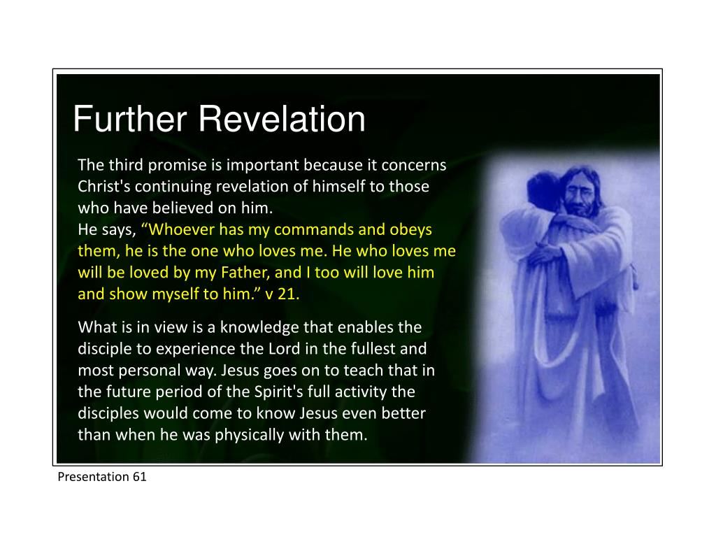 Further Revelation The third promise is important because it concerns Christ's continuing revelation of himself to those who have believed on him. He says, “Whoever has my commands and obeys them, he is the one who loves me. He who loves me will be loved by my Father, and I too will love him and show myself to him.” v 21. What is in view is a knowledge that enables the disciple to experience the Lord in the fullest and most personal way. Jesus goes on to teach that in the future period of the Spirit's full activity the disciples would come to know Jesus even better than when he was physically with them. Presentation 61