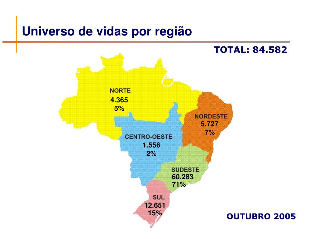 Universo de vidas por região TOTAL: 84.582 4.365 5% 5.727 7% 1.556 2% 60.283 71% 12.651 15% OUTUBRO 2005