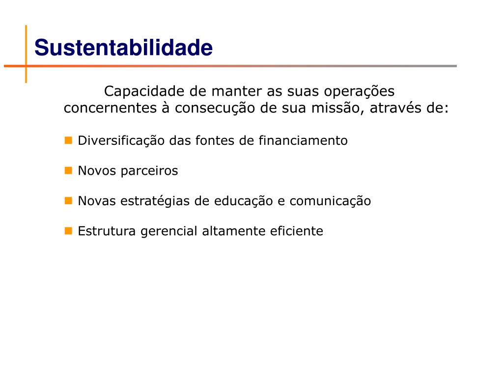 Sustentabilidade Capacidade de manter as suas operações concernentes à consecução de sua missão, através de: • Diversificação das fontes de financiamento • Novos parceiros • Novas estratégias de educação e comunicação • Estrutura gerencial altamente eficiente
