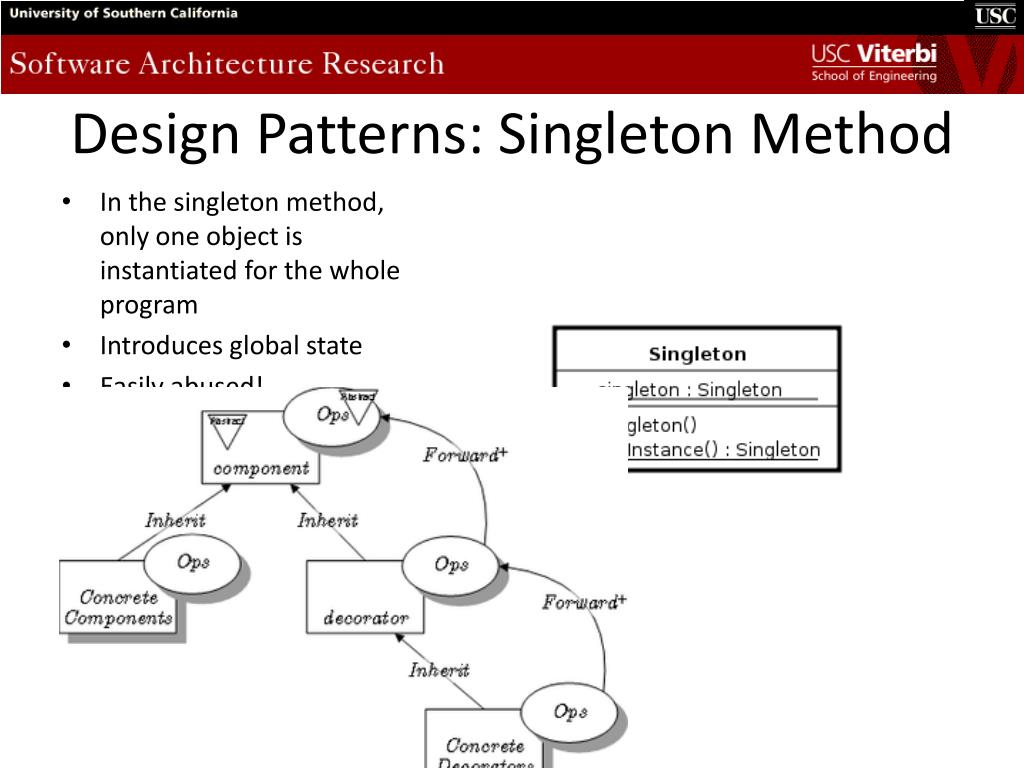 Design Patterns: Singleton Method • In the singleton method, only one object is instantiated for the whole program • Introduces global state • Easily abused!