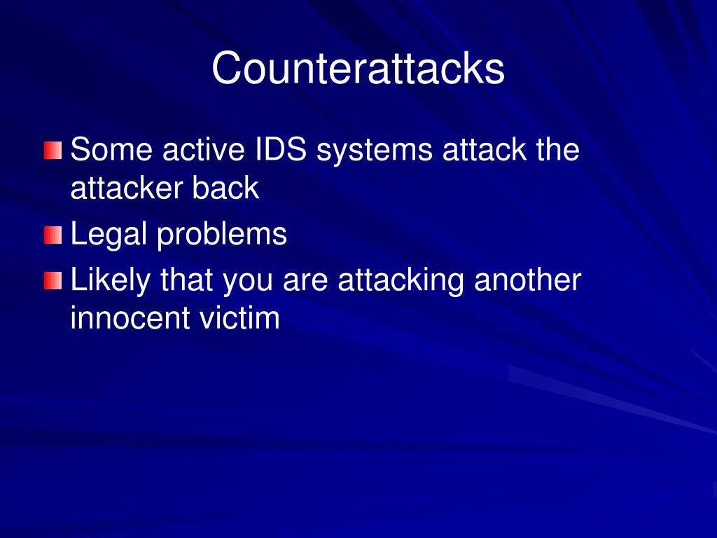 Counterattacks • Some active IDS systems attack the attacker back • Legal problems • Likely that you are attacking another innocent victim