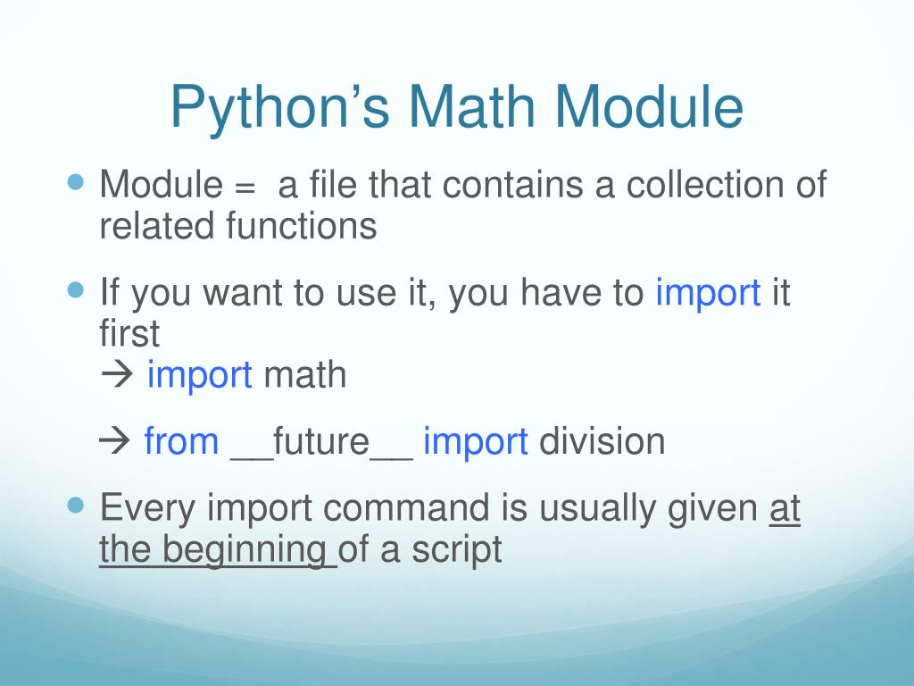 Python’s Math Module • Module = a file that contains a collection of related functions • If you want to use it, you have to import it first import math from __future__ import division • Every import command is usually given at the beginning of a script