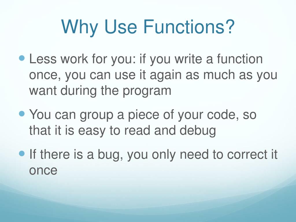 Why Use Functions? • Less work for you: if you write a function once, you can use it again as much as you want during the program • You can group a piece of your code, so that it is easy to read and debug • If there is a bug, you only need to correct it once
