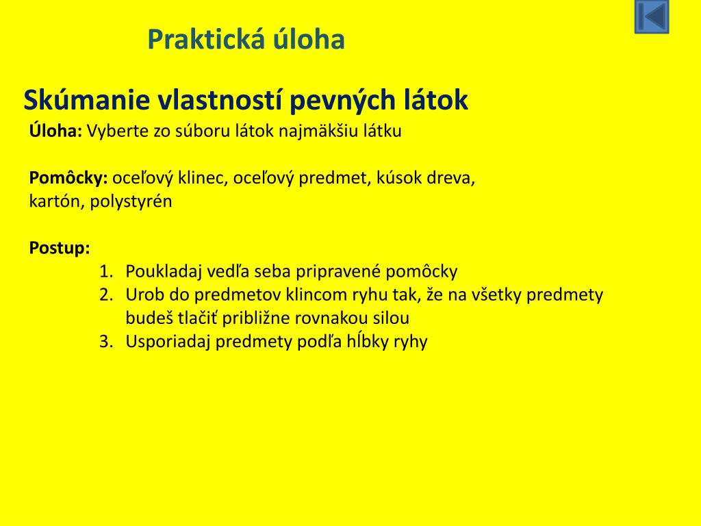 Praktická úloha Skúmanie vlastností pevných látok • Úloha: Vyberte zo súboru látok najmäkšiu látku • Pomôcky: oceľový klinec, oceľový predmet, kúsok dreva, • kartón, polystyrén • Postup: • Poukladaj vedľa seba pripravené pomôcky • Urob do predmetov klincom ryhu tak, že na všetky predmety budeš tlačiť približne rovnakou silou • Usporiadaj predmety podľa hĺbky ryhy