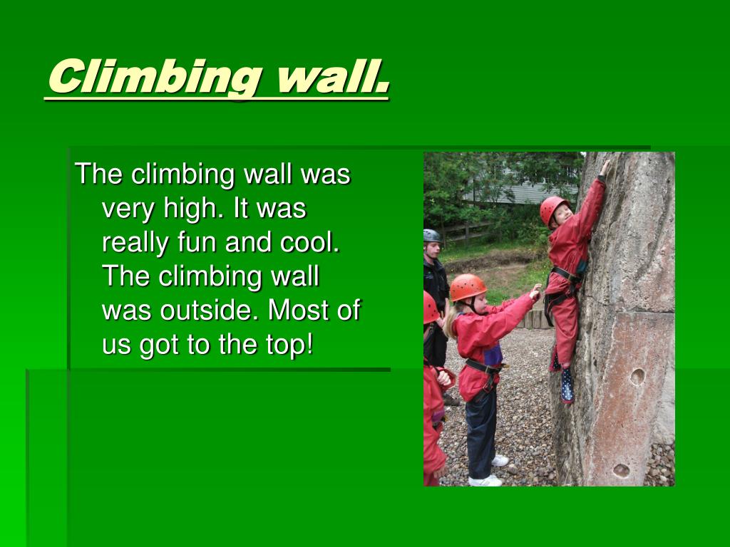 Climbing wall. The climbing wall was very high. It was really fun and cool. The climbing wall was outside. Most of us got to the top!