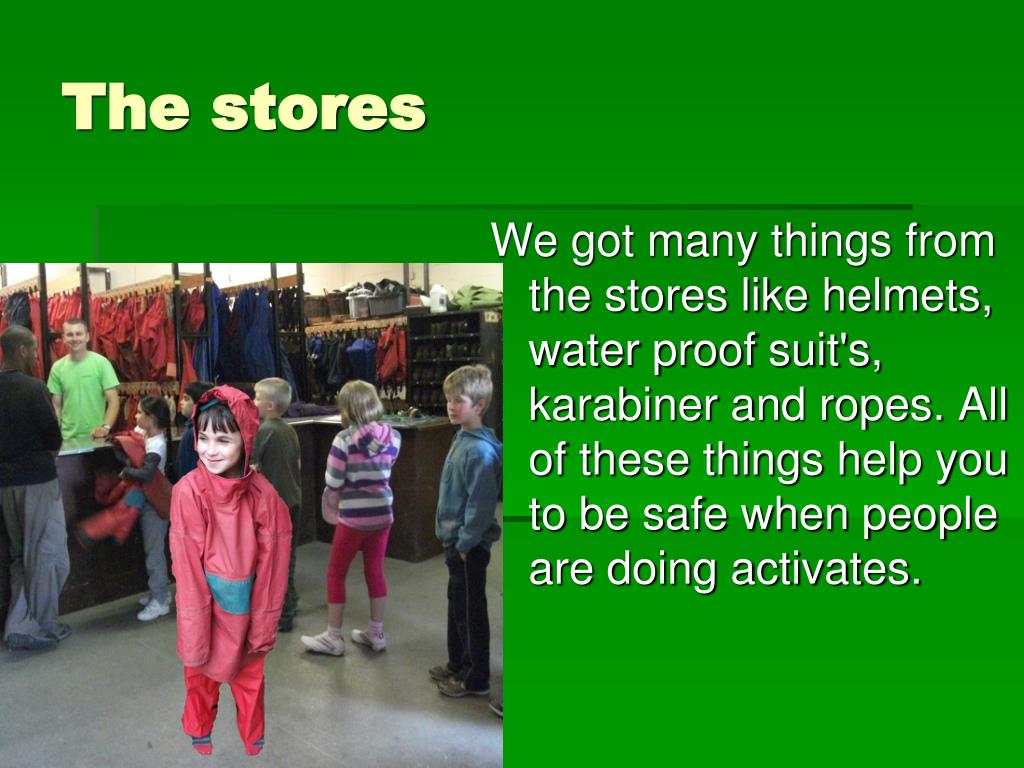We got many things from the stores like helmets, water proof suit's, karabiner and ropes. All of these things help you to be safe when people are doing activates. The stores