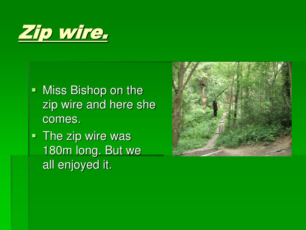 Zip wire. • Miss Bishop on the zip wire and here she comes. • The zip wire was 180m long. But we all enjoyed it.