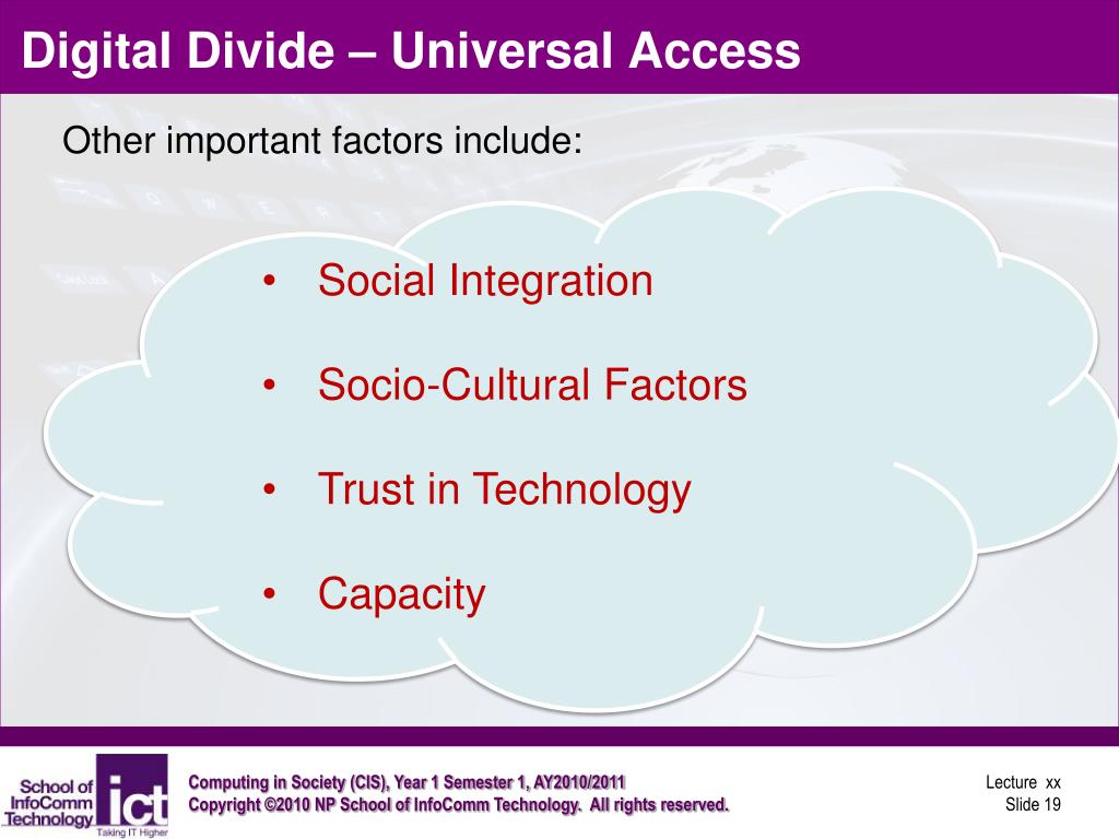 Digital Divide – Universal Access Other important factors include: • Social Integration • Socio-Cultural Factors • Trust in Technology • Capacity