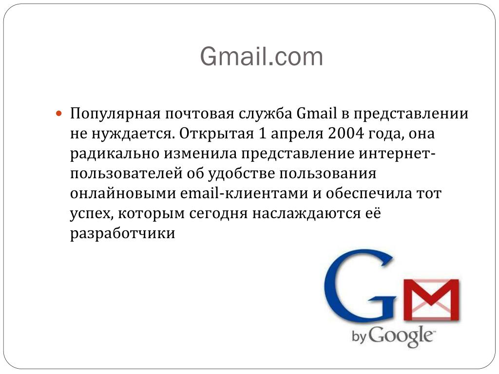 Gmail.com • Популярная почтовая служба Gmail в представлении не нуждается. Открытая 1 апреля 2004 года, она радикально изменила представление интернет-пользователей об удобстве пользования онлайновыми email-клиентами и обеспечила тот успех, которым сегодня наслаждаются её разработчики