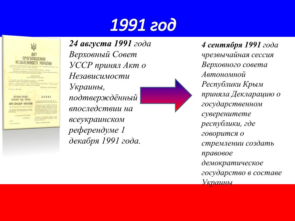 1991 год 4 сентября 1991 года чрезвычайная сессия Верховного совета Автономной Республики Крым приняла Декларацию о государственном суверенитете республики, где говорится о стремлении создать правовое демократическое государство в составе Украины 24 августа 1991 года Верховный Совет УССР принял Акт о Независимости Украины, подтверждённый впоследствии на всеукраинском референдуме 1 декабря 1991 года.