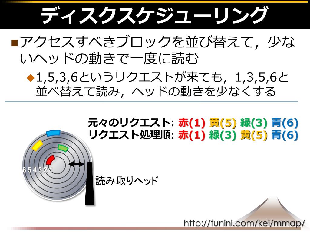 ディスクスケジューリング • アクセスすべきブロックを並び替えて,少ないヘッドの動きで一度に読む • 1,5,3,6というリクエストが来ても,1,3,5,6と並べ替えて読み,ヘッドの動きを少なくする 元々のリクエスト:赤(1)黄(5)緑(3)青(6) リクエスト処理順: 赤(1)緑(3) 黄(5) 青(6) 6 5 4 3 2 1 読み取りヘッド