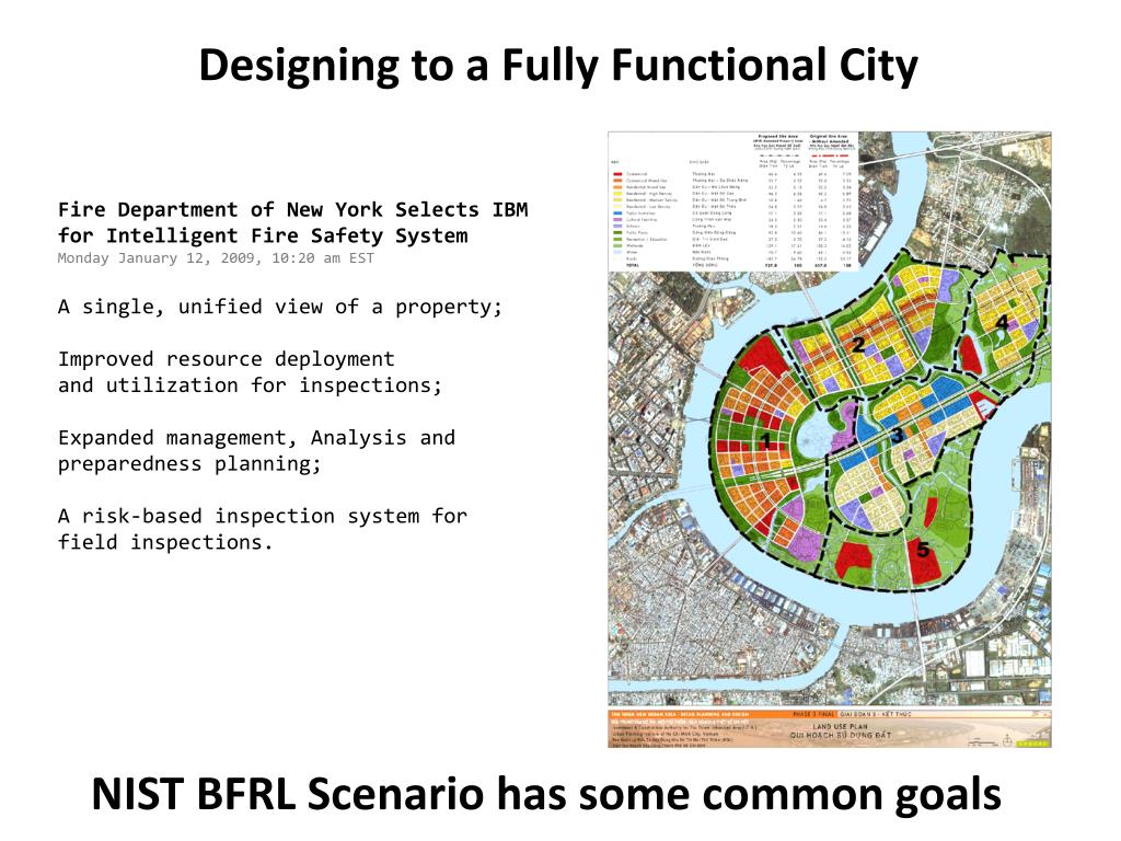 Designing to a Fully Functional City Fire Department of New York Selects IBM for Intelligent Fire Safety System Monday January 12, 2009, 10:20 am EST A single, unified view of a property; Improved resource deployment and utilization for inspections; Expanded management, Analysis and preparedness planning; A risk-based inspection system for field inspections. NIST BFRL Scenario has some common goals