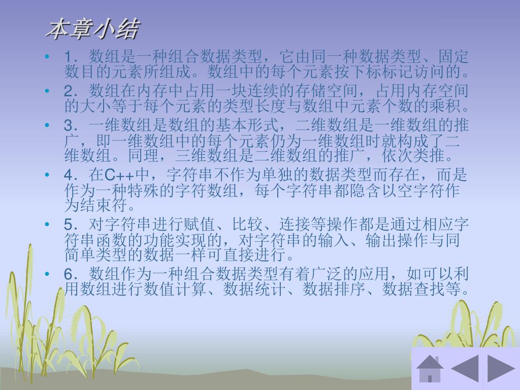 本章小结 • 1.数组是一种组合数据类型,它由同一种数据类型、固定数目的元素所组成。数组中的每个元素按下标标记访问的。 • 2.数组在内存中占用一块连续的存储空间,占用内存空间的大小等于每个元素的类型长度与数组中元素个数的乘积。 • 3.一维数组是数组的基本形式,二维数组是一维数组的推广,即一维数组中的每个元素仍为一维数组时就构成了二维数组。同理,三维数组是二维数组的推广,依次类推。 • 4.在C++中,字符串不作为单独的数据类型而存在,而是作为一种特殊的字符数组,每个字符串都隐含以空字符作为结束符。 • 5.对字符串进行赋值、比较、连接等操作都是通过相应字符串函数的功能实现的,对字符串的输入、输出操作与同简单类型的数据一样可直接进行。 • 6.数组作为一种组合数据类型有着广泛的应用,如可以利用数组进行数值计算、数据统计、数据排序、数据查找等。