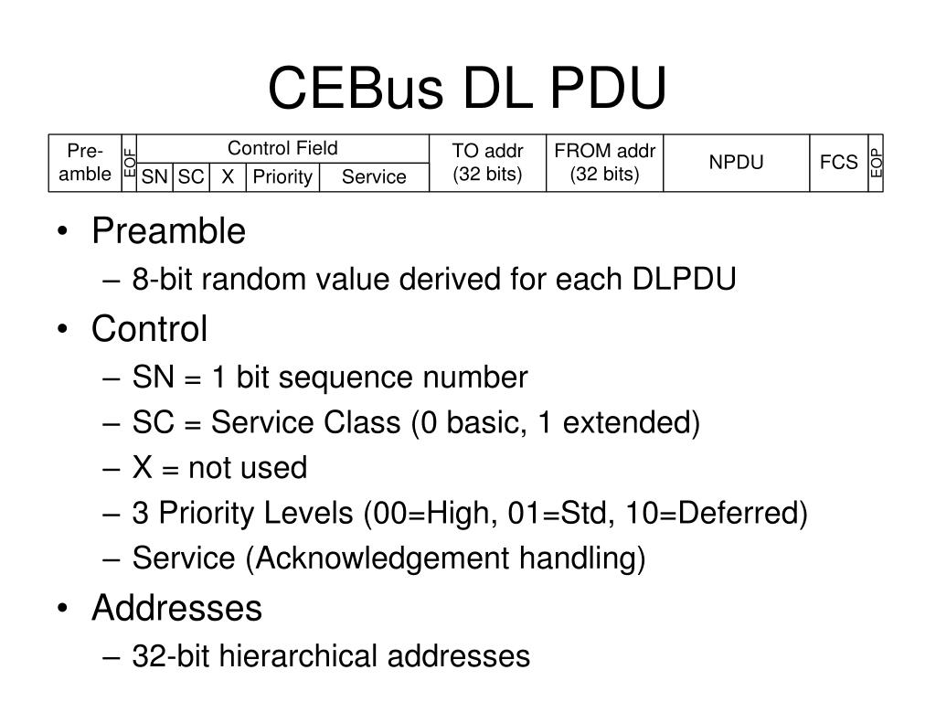 CEBus DL PDU • Preamble • 8-bit random value derived for each DLPDU • Control • SN = 1 bit sequence number • SC = Service Class (0 basic, 1 extended) • X = not used • 3 Priority Levels (00=High, 01=Std, 10=Deferred) • Service (Acknowledgement handling) • Addresses • 32-bit hierarchical addresses