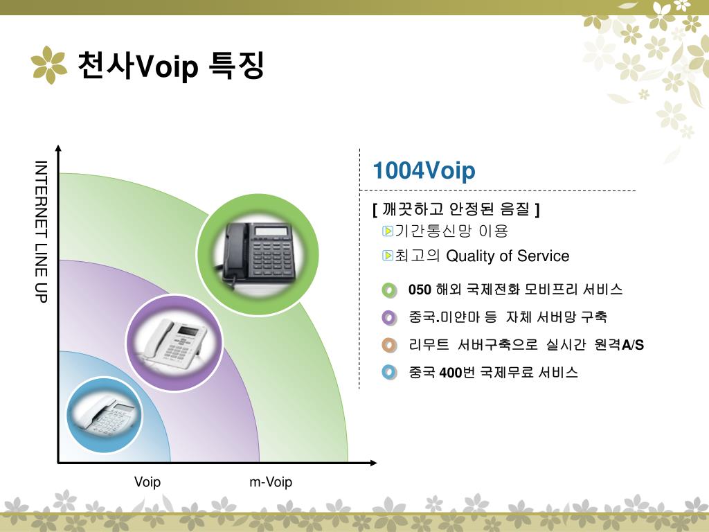 천사Voip특징 1004Voip [ 깨끗하고 안정된 음질 ] 기간통신망 이용 최고의 Quality of Service INTERNET LINE UP 050 해외 국제전화 모비프리 서비스 중국.미얀마 등 자체 서버망 구축 리무트 서버구축으로 실시간 원격A/S 중국 400번 국제무료 서비스 Voip m-Voip