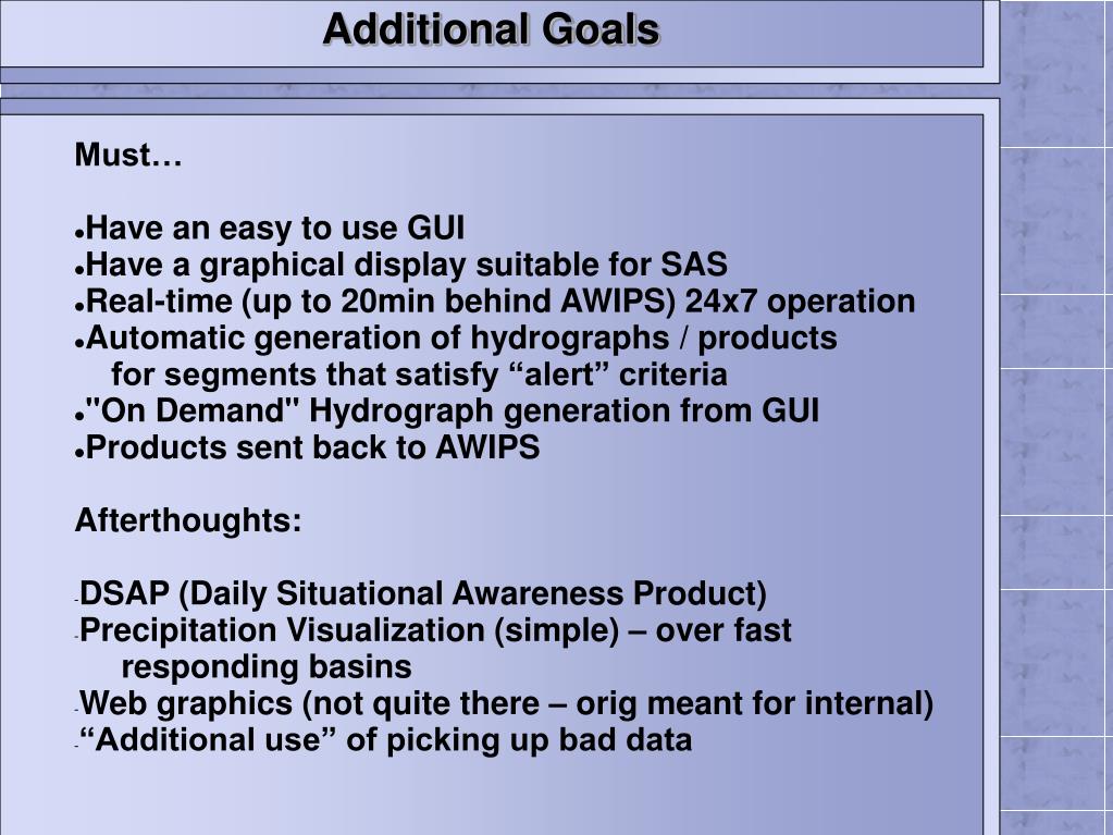 Additional Goals • Must… • Have an easy to use GUI • Have a graphical display suitable for SAS • Real-time (up to 20min behind AWIPS) 24x7 operation • Automatic generation of hydrographs / products • for segments that satisfy “alert” criteria • "On Demand" Hydrograph generation from GUI • Products sent back to AWIPS • Afterthoughts: • DSAP (Daily Situational Awareness Product) • Precipitation Visualization (simple) – over fast responding basins • Web graphics (not quite there – orig meant for internal) • “Additional use” of picking up bad data