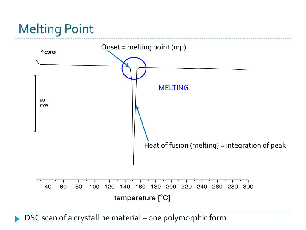 Melting Point Onset = melting point (mp) MELTING Heat of fusion (melting) = integration of peak DSC scan of a crystalline material – one polymorphic form