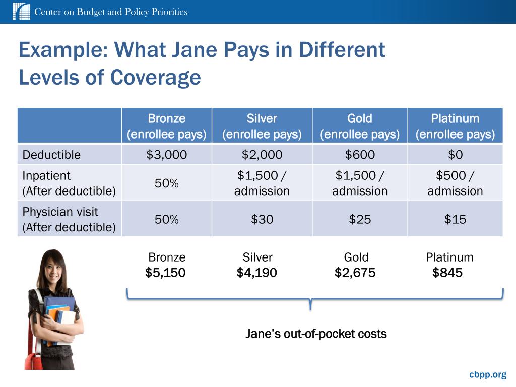 Example: What Jane Pays in Different Levels of Coverage Bronze $5,150 Silver $4,190 Gold $2,675 Platinum $845 Jane’s out-of-pocket costs