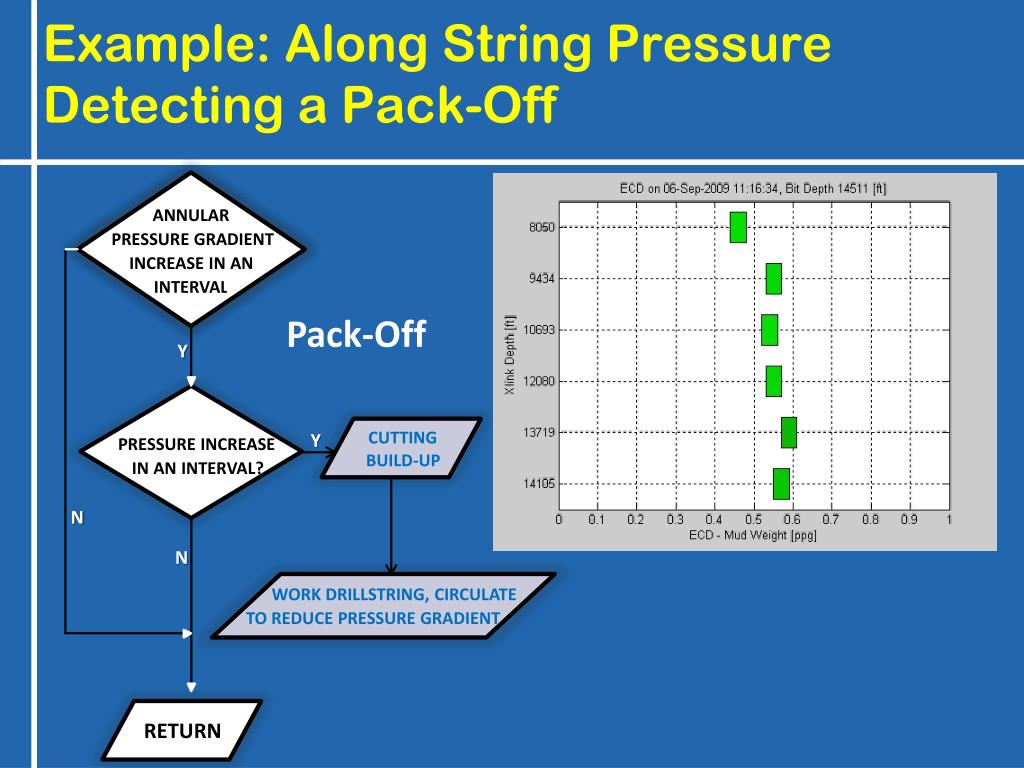 Example: Along String Pressure Detecting a Pack-Off ANNULAR PRESSURE GRADIENT INCREASE IN AN INTERVAL ? Pack-Off Y CUTTING Y PRESSURE INCREASE BUILD-UP IN AN INTERVAL? N N WORK DRILLSTRING, CIRCULATE TO REDUCE PRESSURE GRADIENT RETURN