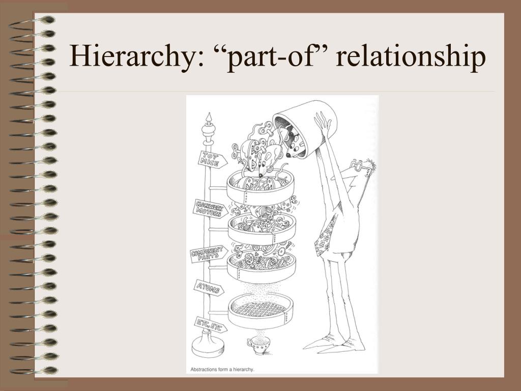 Hierarchy • Hierarchy is a ranking or ordering of abstractions • Two most important hierarchies • The “part-of” relationship, or aggregation • The “is-a” relationship , or inheritance • Inheritance, also known as subclassing • Single inheritance: the only legal way in Java • Multiple inheritance: supported in C++