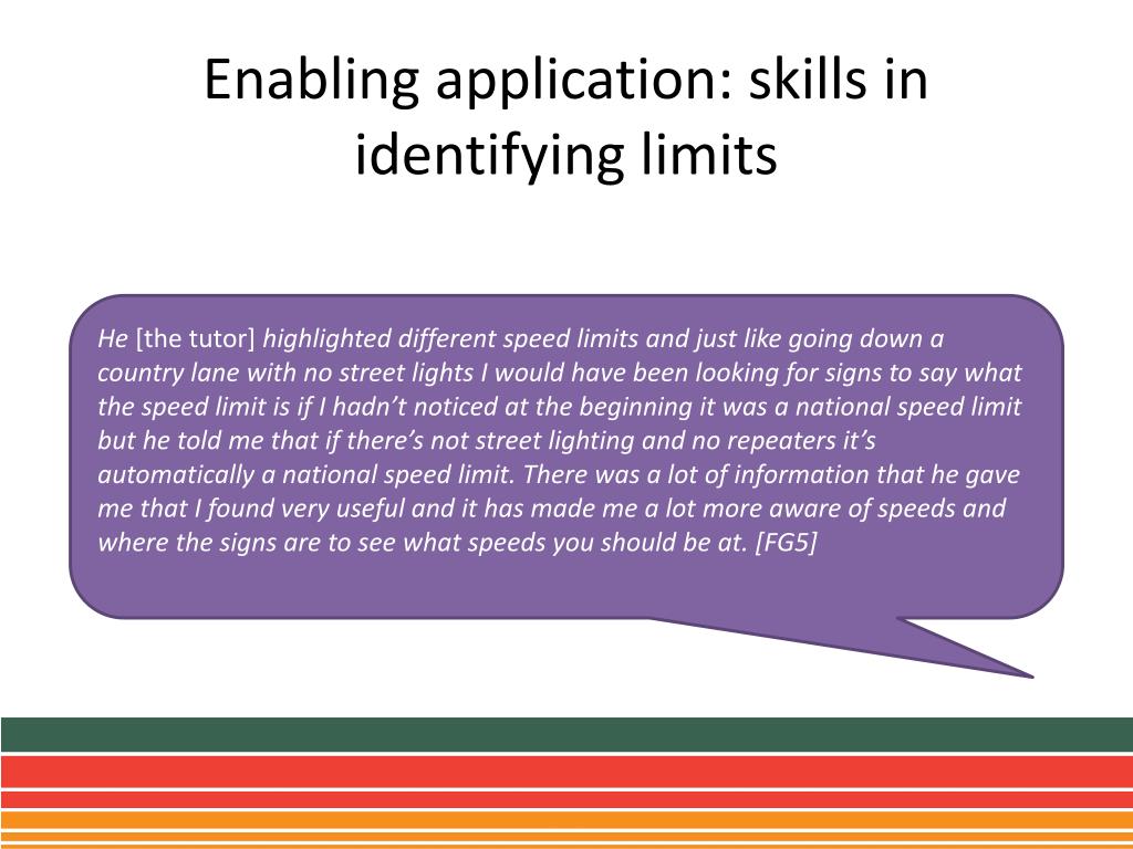 Enabling application: skills in identifying limits He [the tutor] highlighted different speed limits and just like going down a country lane with no street lights I would have been looking for signs to say what the speed limit is if I hadn’t noticed at the beginning it was a national speed limit but he told me that if there’s not street lighting and no repeaters it’s automatically a national speed limit. There was a lot of information that he gave me that I found very useful and it has made me a lot more aware of speeds and where the signs are to see what speeds you should be at. [FG5]