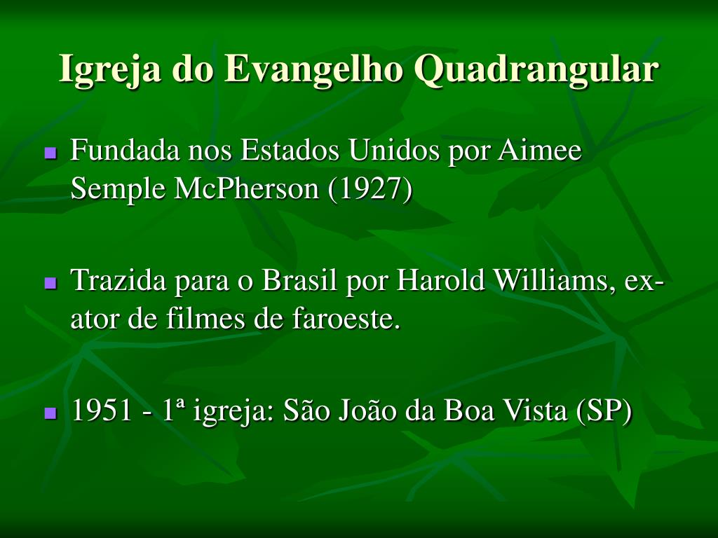 Igreja do Evangelho Quadrangular • Fundada nos Estados Unidos por Aimee Semple McPherson (1927) • Trazida para o Brasil por Harold Williams, ex-ator de filmes de faroeste. • 1951 - 1ª igreja: São João da Boa Vista (SP)