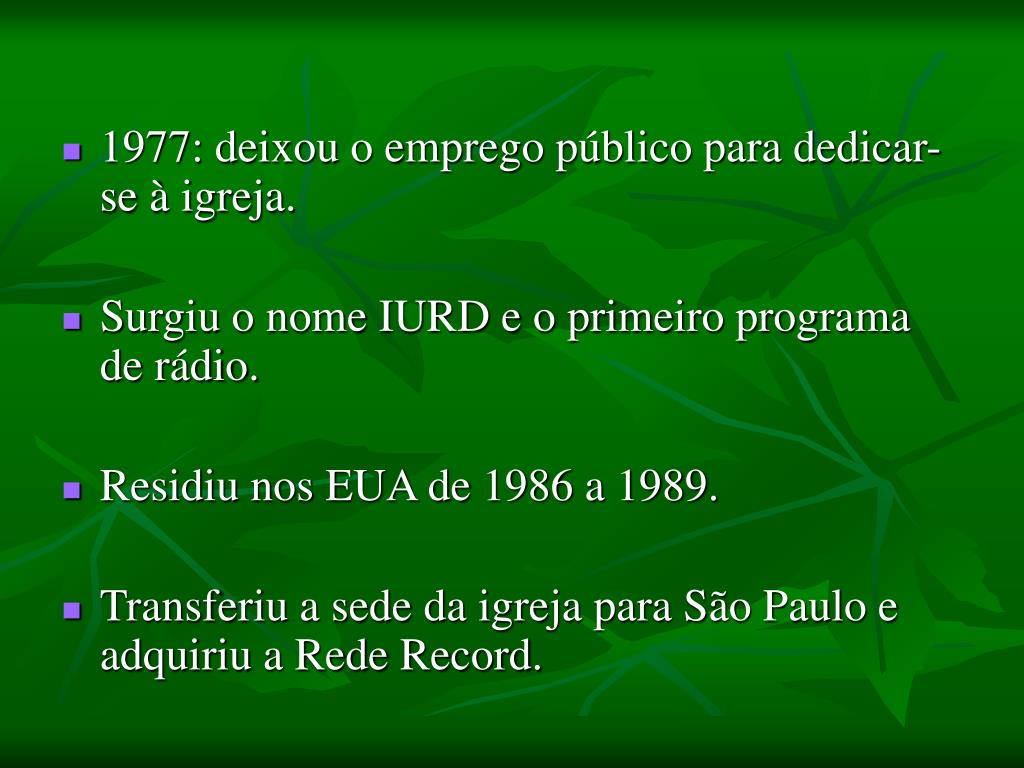 1977: deixou o emprego público para dedicar-se à igreja. • Surgiu o nome IURD e o primeiro programa de rádio. • Residiu nos EUA de 1986 a 1989. • Transferiu a sede da igreja para São Paulo e adquiriu a Rede Record.
