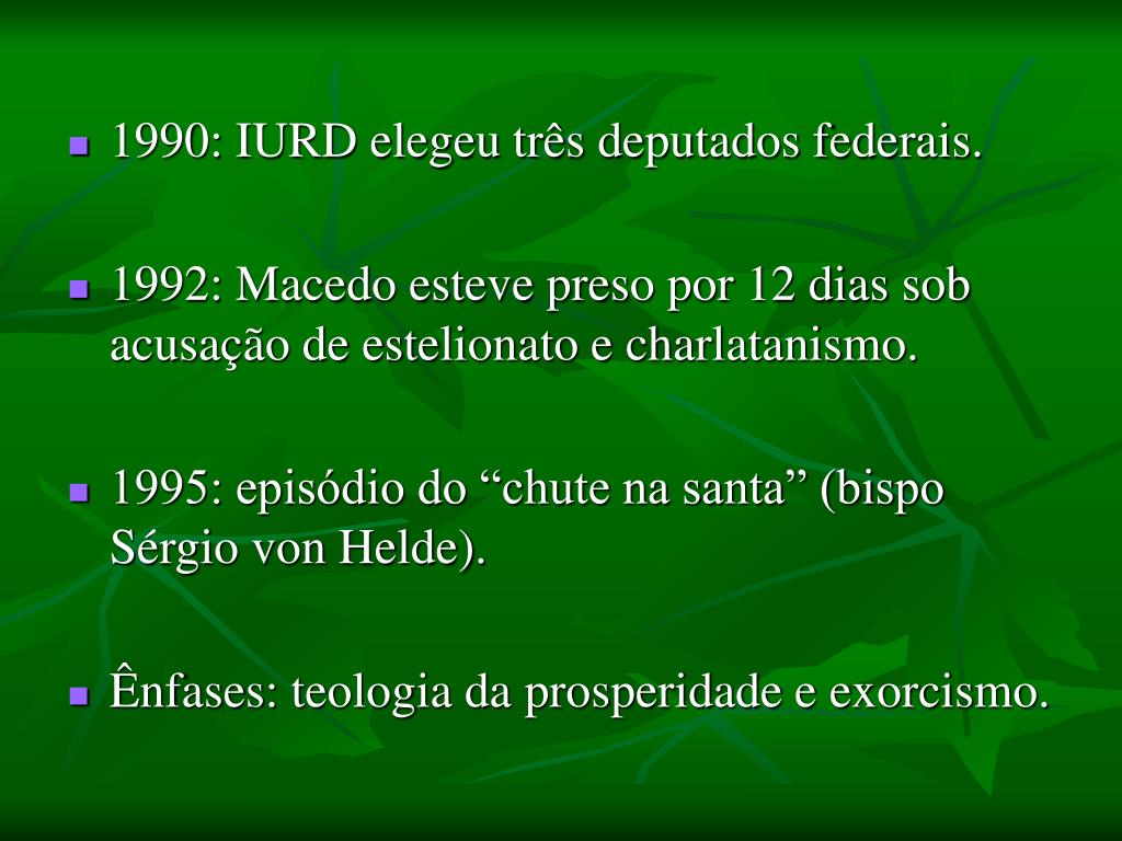 1990: IURD elegeu três deputados federais. • 1992: Macedo esteve preso por 12 dias sob acusação de estelionato e charlatanismo. • 1995: episódio do “chute na santa” (bispo Sérgio von Helde). • Ênfases: teologia da prosperidade e exorcismo.