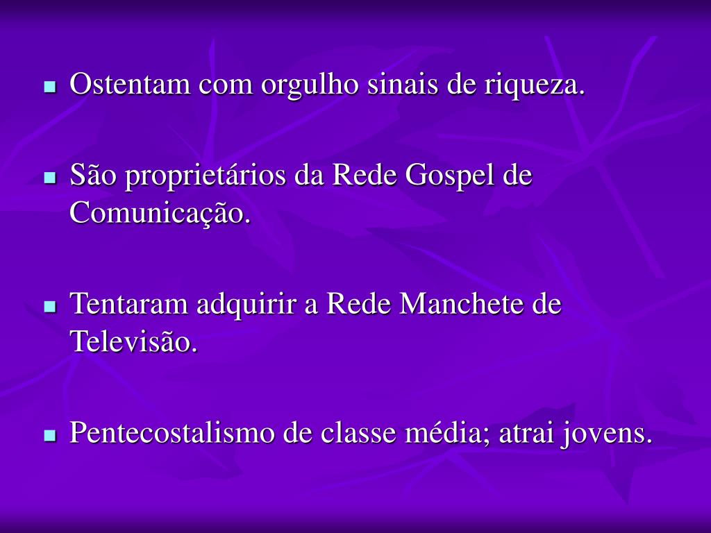 Ostentam com orgulho sinais de riqueza. • São proprietários da Rede Gospel de Comunicação. • Tentaram adquirir a Rede Manchete de Televisão. • Pentecostalismo de classe média; atrai jovens.