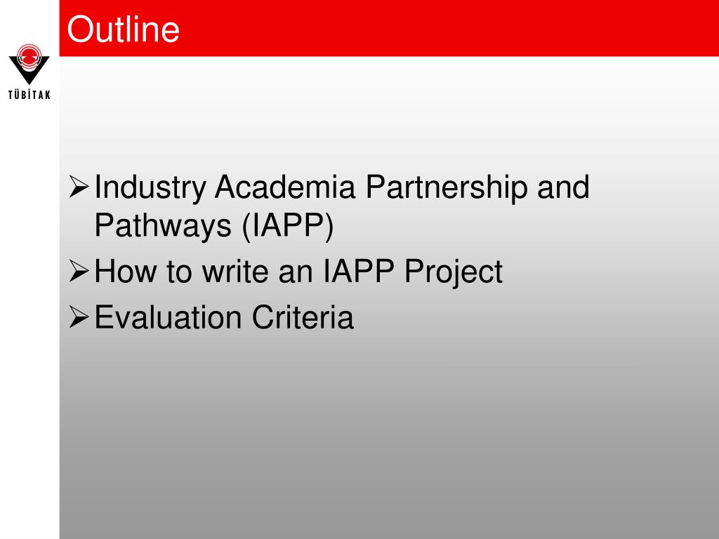FP7 People Specific Programme Industry – Academia Partnerships and Pathways (IAPP) Orbay BÜLBÜL People National Contact Point TUBITAK EU FP National Coordination Office. Outline. Industry Academia Partnership and Pathways (IAPP) How to write an IAPP Project Evaluation Criteria. IAPP.