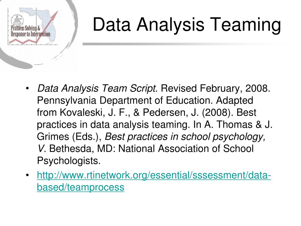 Data Analysis Teaming • Data Analysis Team Script. Revised February, 2008. Pennsylvania Department of Education. Adapted from Kovaleski, J. F., & Pedersen, J. (2008). Best practices in data analysis teaming. In A. Thomas & J. Grimes (Eds.), Best practices in school psychology, V. Bethesda, MD: National Association of School Psychologists. • http://www.rtinetwork.org/essential/sssessment/data-based/teamprocess