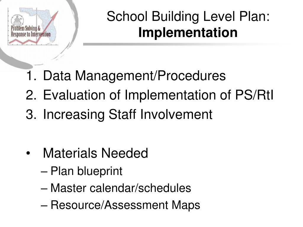 School Building Level Plan: Implementation • Data Management/Procedures • Evaluation of Implementation of PS/RtI • Increasing Staff Involvement • Materials Needed • Plan blueprint • Master calendar/schedules • Resource/Assessment Maps
