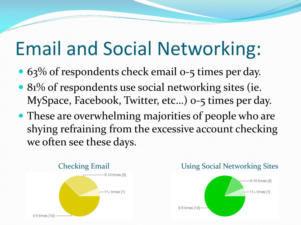 Email and Social Networking: • 63% of respondents check email 0-5 times per day. • 81% of respondents use social networking sites (ie. MySpace, Facebook, Twitter, etc…) 0-5 times per day. • These are overwhelming majorities of people who are shying refraining from the excessive account checking we often see these days. Checking Email Using Social Networking Sites
