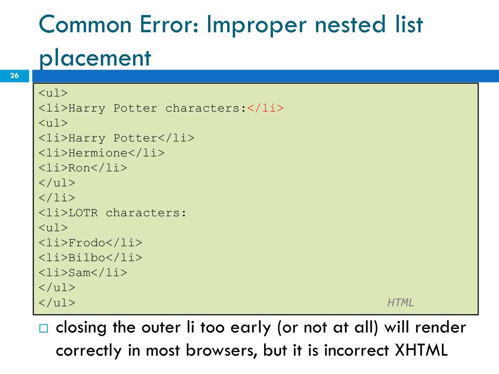 Common Error: Improper nested list placement <ul> <li>Harry Potter characters:</li> <ul> <li>Harry Potter</li> <li>Hermione</li> <li>Ron</li> </ul> </li> <li>LOTR characters: <ul> <li>Frodo</li> <li>Bilbo</li> <li>Sam</li> </ul> </ul>HTML • closing the outer li too early (or not at all) will render correctly in most browsers, but it is incorrect XHTML