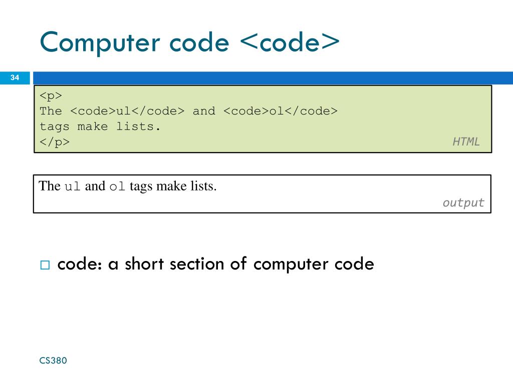 Computer code <code> <p> The <code>ul</code> and <code>ol</code> tags make lists. </p>HTML • code: a short section of computer code The ul and ol tags make lists.output CS380