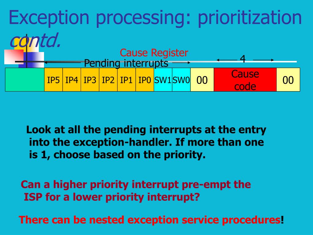 Exception processing: Control transfer Contd. While in exception-handler, can another exception be accepted? EPC gets overwritten similar to $ra! One of the first acts in exception-handler should be to save EPC, cause, and status register on a stack. While saving these registers, should we disable all the interrupts?