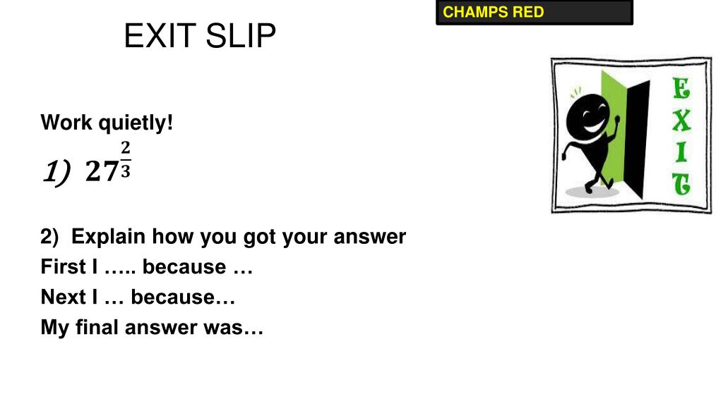 CHAMPS RED Exit Slip Work quietly! • Explain how you got your answer First I ….. because … Next I … because… My final answer was…