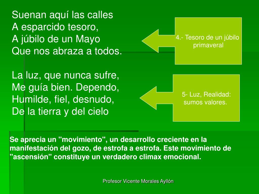 4.- Tesoro de un júbilo primaveral Suenan aquí las calles A esparcido tesoro, A júbilo de un Mayo Que nos abraza a todos. La luz, que nunca sufre, Me guía bien. Dependo, Humilde, fiel, desnudo, De la tierra y del cielo 5- Luz, Realidad: sumos valores. Se aprecia un "movimiento", un desarrollo creciente en la manifestación del gozo, de estrofa a estrofa. Este movimiento de "ascensión" constituye un verdadero climax emocional. Profesor Vicente Morales Ayllón