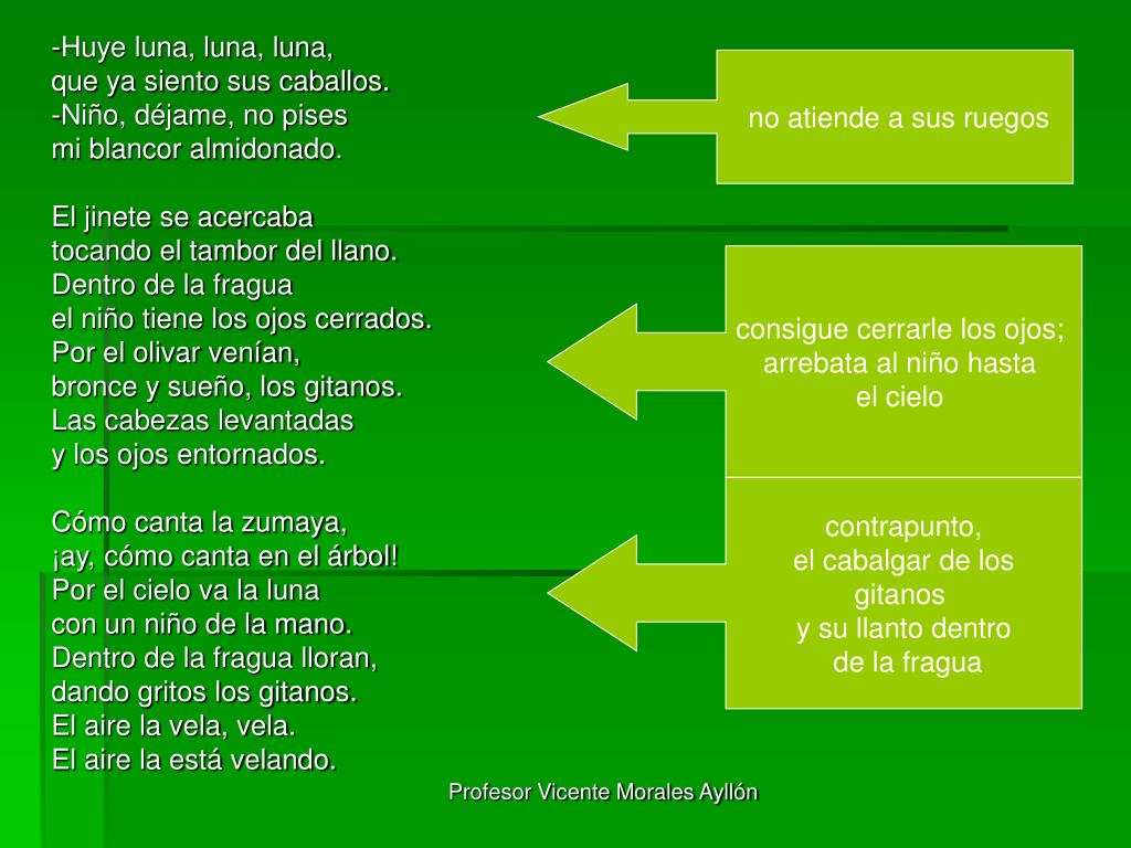-Huye luna, luna, luna, que ya siento sus caballos. -Niño, déjame, no pises mi blancor almidonado. El jinete se acercaba tocando el tambor del llano. Dentro de la fragua el niño tiene los ojos cerrados. Por el olivar venían, bronce y sueño, los gitanos. Las cabezas levantadas y los ojos entornados. Cómo canta la zumaya, ¡ay, cómo canta en el árbol! Por el cielo va la luna con un niño de la mano. Dentro de la fragua lloran, dando gritos los gitanos. El aire la vela, vela. El aire la está velando. no atiende a sus ruegos consigue cerrarle los ojos; arrebata al niño hasta el cielo contrapunto, el cabalgar de los gitanos y su llanto dentro de la fragua Profesor Vicente Morales Ayllón