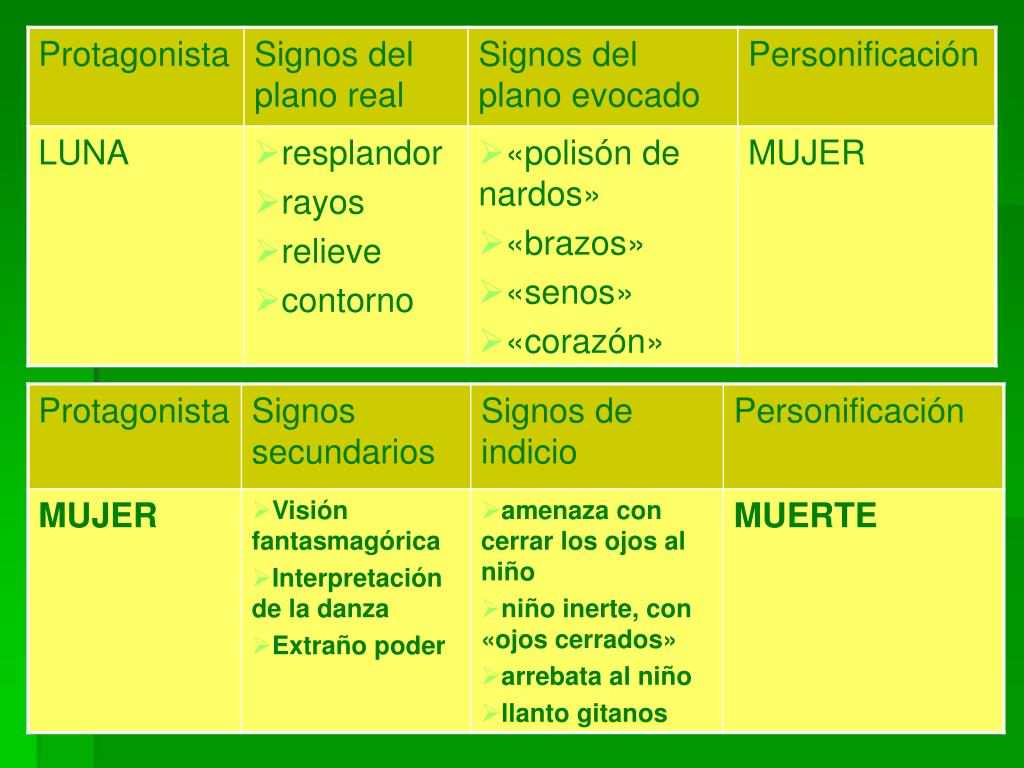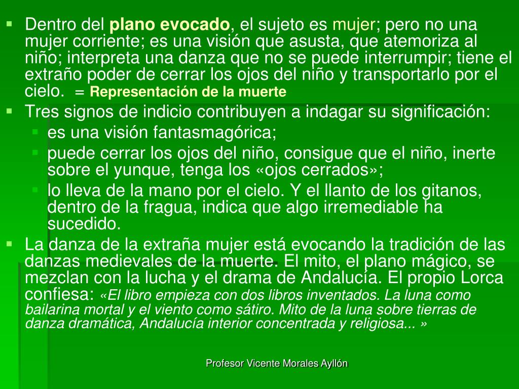 Dentro del plano evocado, el sujeto es mujer; pero no una mujer corriente; es una visión que asusta, que atemoriza al niño; interpreta una danza que no se puede interrumpir; tiene el extraño poder de cerrar los ojos del niño y transportarlo por el cielo. = Representación de la muerte • Tres signos de indicio contribuyen a indagar su significación: • es una visión fantasmagórica; • puede cerrar los ojos del niño, consigue que el niño, inerte sobre el yunque, tenga los «ojos cerrados»; • lo lleva de la mano por el cielo. Y el llanto de los gitanos, dentro de la fragua, indica que algo irremediable ha sucedido. • La danza de la extraña mujer está evocando la tradición de las danzas medievales de la muerte. El mito, el plano mágico, se mezclan con la lucha y el drama de Andalucía. El propio Lorca confiesa: «El libro empieza con dos libros inventados. La luna como bailarina mortal y el viento como sátiro. Mito de la luna sobre tierras de danza dramática, Andalucía interior concentrada y religiosa... » Profesor Vicente Morales Ayllón