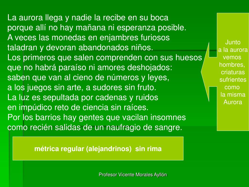 La aurora llega y nadie la recibe en su boca porque allí no hay mañana ni esperanza posible. A veces las monedas en enjambres furiosos taladran y devoran abandonados niños. Los primeros que salen comprenden con sus huesos que no habrá paraíso ni amores deshojados: saben que van al cieno de números y leyes, a los juegos sin arte, a sudores sin fruto. La luz es sepultada por cadenas y ruidos en impúdico reto de ciencia sin raíces. Por los barrios hay gentes que vacilan insomnes como recién salidas de un naufragio de sangre. Junto a la aurora vemos hombres, criaturas sufrientes como la misma Aurora métrica regular (alejandrinos) sin rima Profesor Vicente Morales Ayllón