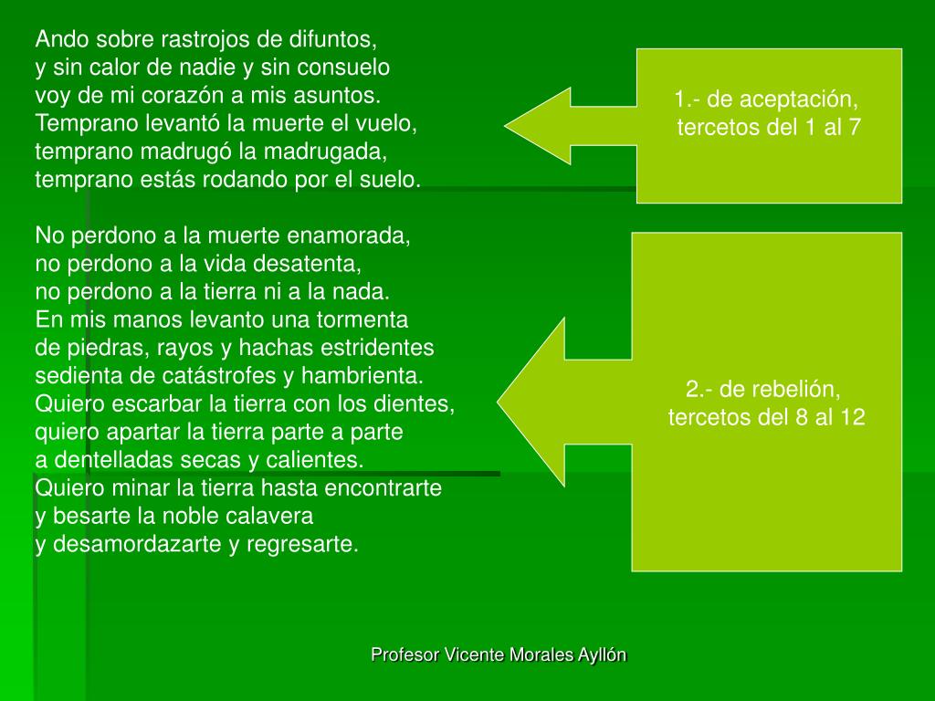 Ando sobre rastrojos de difuntos, y sin calor de nadie y sin consuelo voy de mi corazón a mis asuntos. Temprano levantó la muerte el vuelo, temprano madrugó la madrugada, temprano estás rodando por el suelo. No perdono a la muerte enamorada, no perdono a la vida desatenta, no perdono a la tierra ni a la nada. En mis manos levanto una tormenta de piedras, rayos y hachas estridentes sedienta de catástrofes y hambrienta. Quiero escarbar la tierra con los dientes, quiero apartar la tierra parte a parte a dentelladas secas y calientes. Quiero minar la tierra hasta encontrarte y besarte la noble calavera y desamordazarte y regresarte. 1.- de aceptación, tercetos del 1 al 7 2.- de rebelión, tercetos del 8 al 12 Profesor Vicente Morales Ayllón