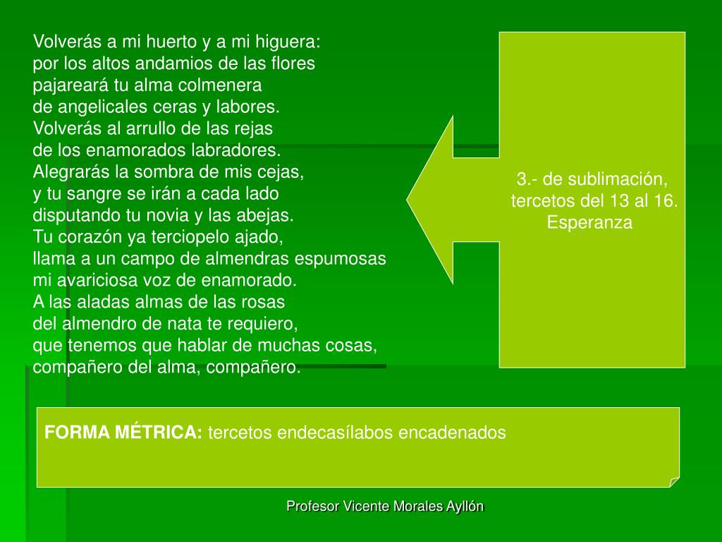 Volverás a mi huerto y a mi higuera: por los altos andamios de las flores pajareará tu alma colmenera de angelicales ceras y labores. Volverás al arrullo de las rejas de los enamorados labradores. Alegrarás la sombra de mis cejas, y tu sangre se irán a cada lado disputando tu novia y las abejas. Tu corazón ya terciopelo ajado, llama a un campo de almendras espumosas mi avariciosa voz de enamorado. A las aladas almas de las rosas del almendro de nata te requiero, que tenemos que hablar de muchas cosas, compañero del alma, compañero. 3.- de sublimación, tercetos del 13 al 16. Esperanza FORMA MÉTRICA: tercetos endecasílabos encadenados Profesor Vicente Morales Ayllón