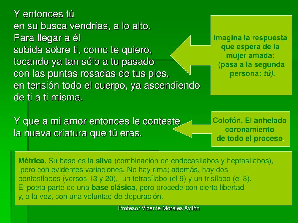 imagina la respuesta que espera de la mujer amada: (pasa a la segunda persona: tú). Y entonces tú en su busca vendrías, a lo alto. Para llegar a él subida sobre ti, como te quiero, tocando ya tan sólo a tu pasado con las puntas rosadas de tus pies, en tensión todo el cuerpo, ya ascendiendo de ti a ti misma. Y que a mi amor entonces le conteste la nueva criatura que tú eras. Colofón. El anhelado coronamiento de todo el proceso. Métrica. Su base es la silva (combinación de endecasílabos y heptasílabos), pero con evidentes variaciones. No hay rima; además, hay dos pentasílabos (versos 13 y 20), un tetrasílabo (el 9) y un trisílabo (el 3). El poeta parte de una base clásica, pero procede con cierta libertad y, a la vez, con una voluntad de depuración. Profesor Vicente Morales Ayllón