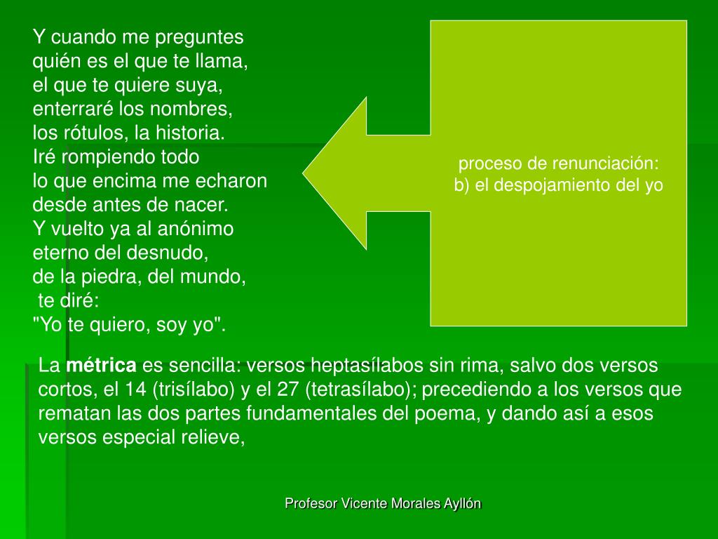 Y cuando me preguntes quién es el que te llama, el que te quiere suya, enterraré los nombres, los rótulos, la historia. Iré rompiendo todo lo que encima me echaron desde antes de nacer. Y vuelto ya al anónimo eterno del desnudo, de la piedra, del mundo, te diré: "Yo te quiero, soy yo". proceso de renunciación: b) el despojamiento del yo La métrica es sencilla: versos heptasílabos sin rima, salvo dos versos cortos, el 14 (trisílabo) y el 27 (tetrasílabo); precediendo a los versos que rematan las dos partes fundamentales del poema, y dando así a esos versos especial relieve, Profesor Vicente Morales Ayllón